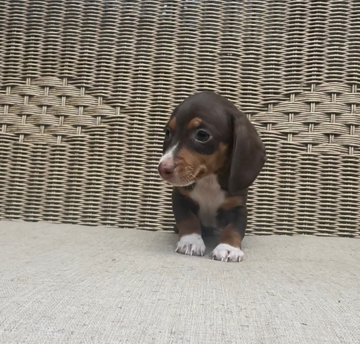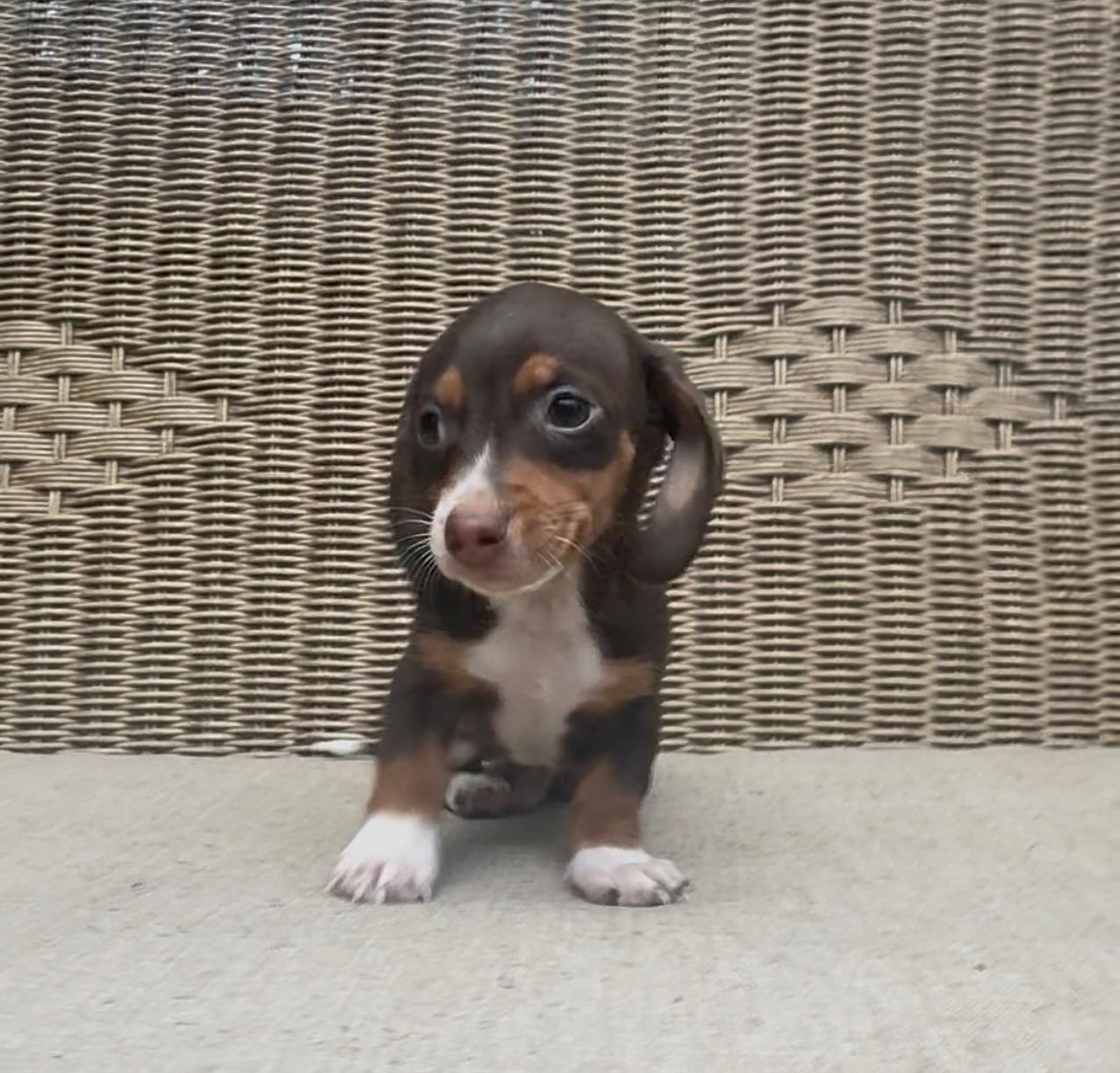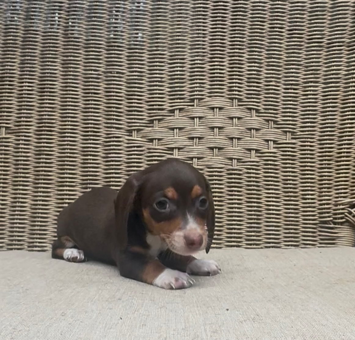 Attention for those looking for a true mini. This little chocolate & tan shorthaired boy is as tiny as he is precious A pocket-sized bundle of sweetness ready to melt hearts everywhere.